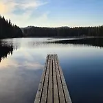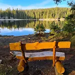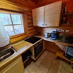 Die 2-Zimmer- Charmantes Ferienhaus am Waldrand verfügt über Parkplätze und eine Terrasse mit Aussicht auf die Berge.